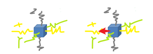 首先对加速度计来进行分析;是如何测量得到加速度的呢?我们可以假设一个悬置的立方体,其上下左右链接了弹簧来支撑将其限制在固定位置(下左图)。当发生加速/减速运动时,由于惯性显然立方体会有一个运动趋势,此时弹簧被挤压受力(下右图),此时假设我们能够准确测量出弹簧所受到压力,那么自然能够反推出立方体受到的力进而得到加速度。