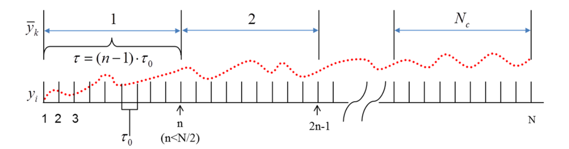 传统的求样本方差的方法可以反映误差序列的整体情况的指标,但无法细分出不同时间尺度上的误差波动情况。而allan方差通过分块处理 + 消除静态偏置的方法。我们要求不同时间尺度的误差分析,那么就将统计数据进行时间分块(块之间的时间尺度相同,但是做不同组实验的时候,时间尺度不同),收集到不同时间尺度对应的allan方差数据。具体公式为:
